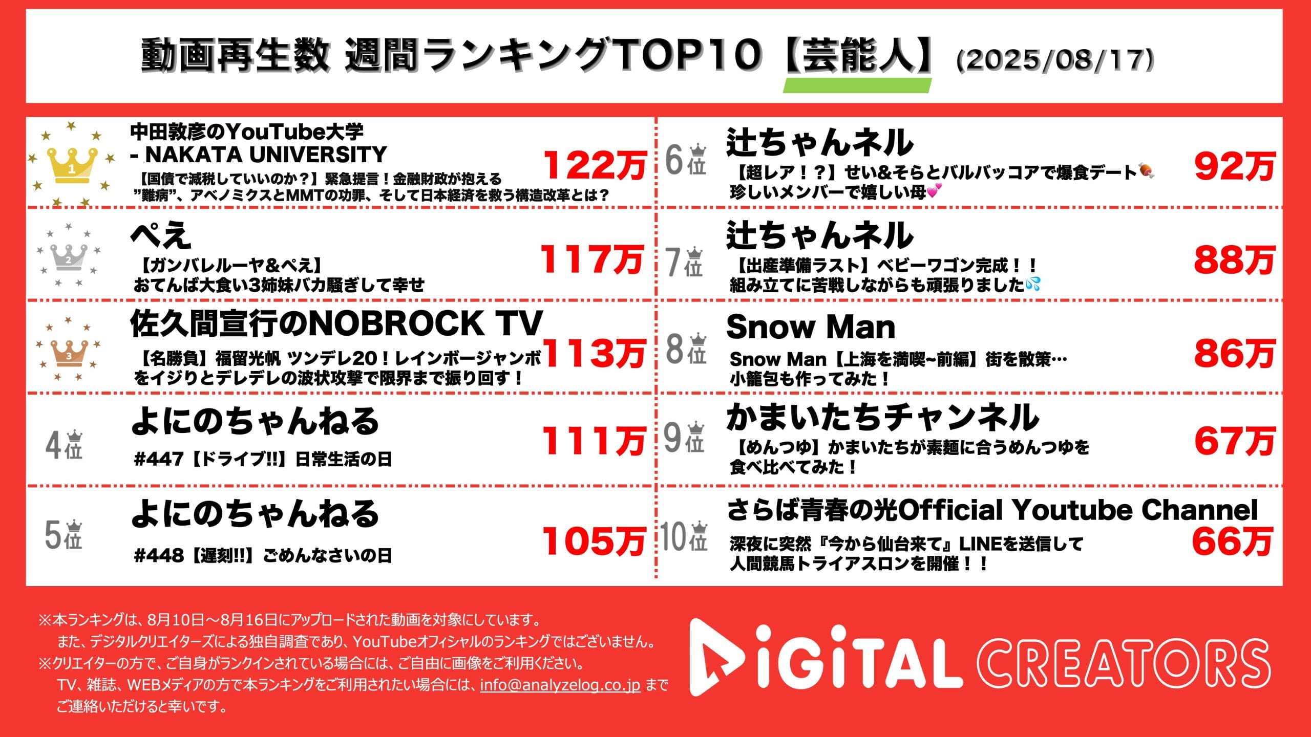 尚、対象は、企業公式チャンネルやニュース動画を除く、1分以上の動画。(切り抜きチャンネルを除く)※データ集計は8月17日で、広告による再生数含まれる可能性があります。
