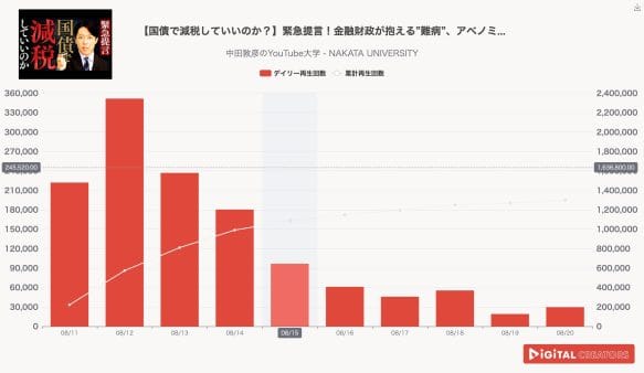 タレントの中田敦彦によるYouTubeチャンネル『中田敦彦のYouTube大学 – NAKATA UNIVERSITY』が1位を獲得した。今回の動画では、参院選で積極財政派が躍進したことを受けて、その是非について説明している。