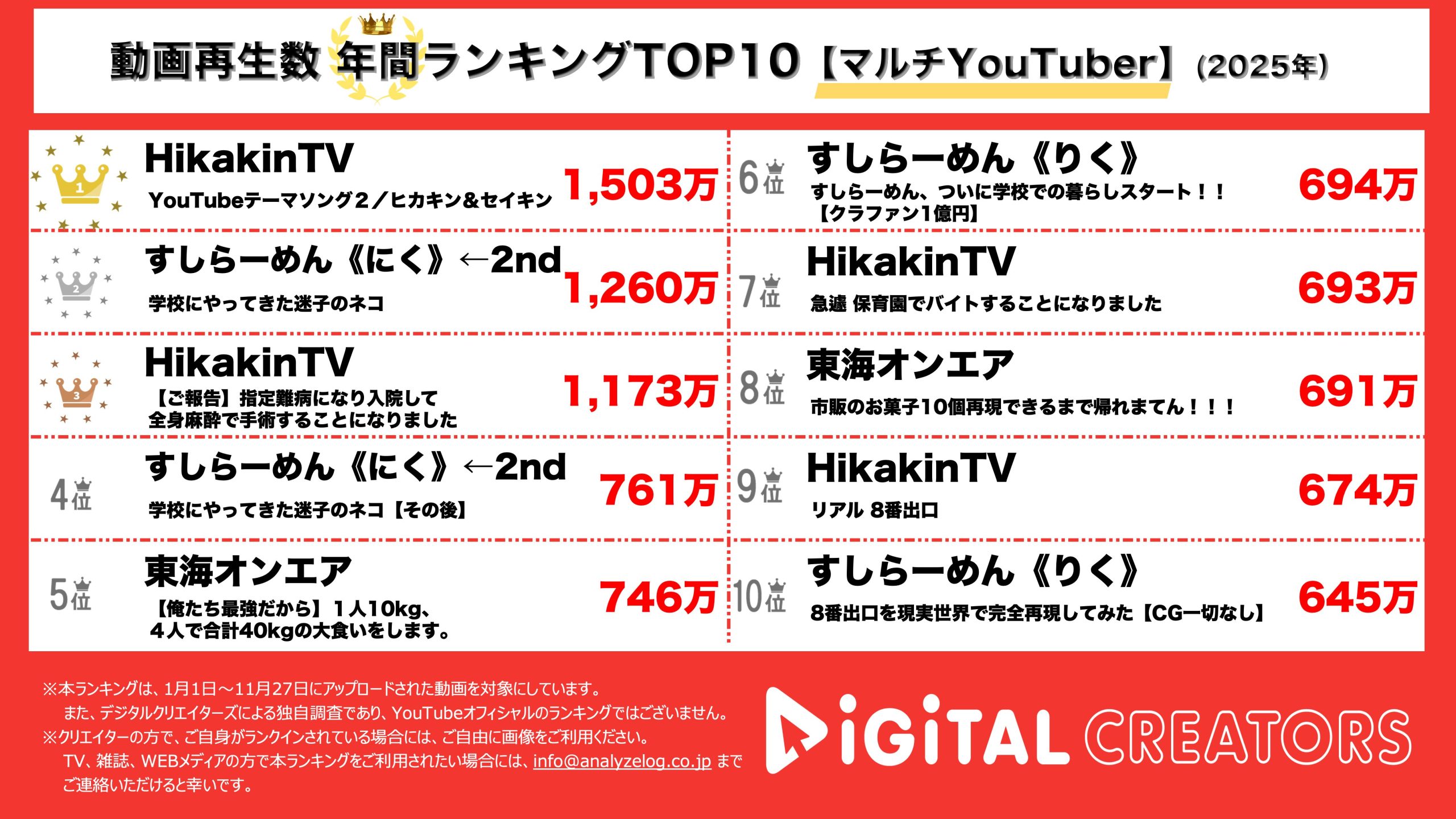 2025年1月1日〜11月27日にYouTube上に公開された動画の再生回数マルチYouTuberランキングを発表。(11月28日集計)