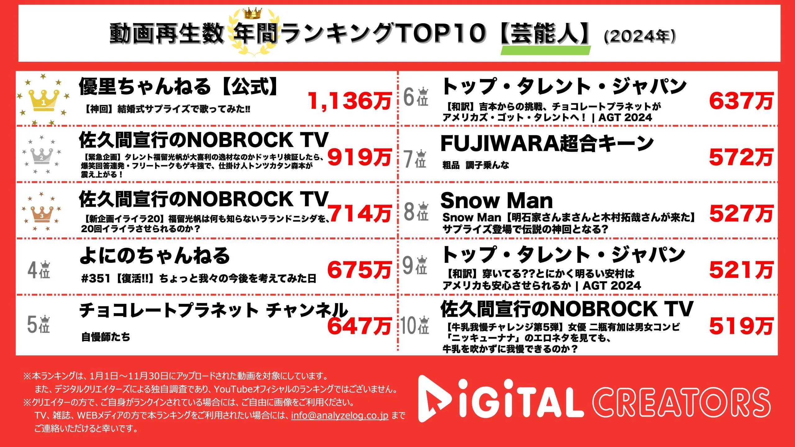 なお対象は、企業公式チャンネルやニュース動画を除く、1分以上の動画(切り抜きチャンネルを除く)。※データ集計は12月6日で、広告による再生数も含まれる可能性があります。
