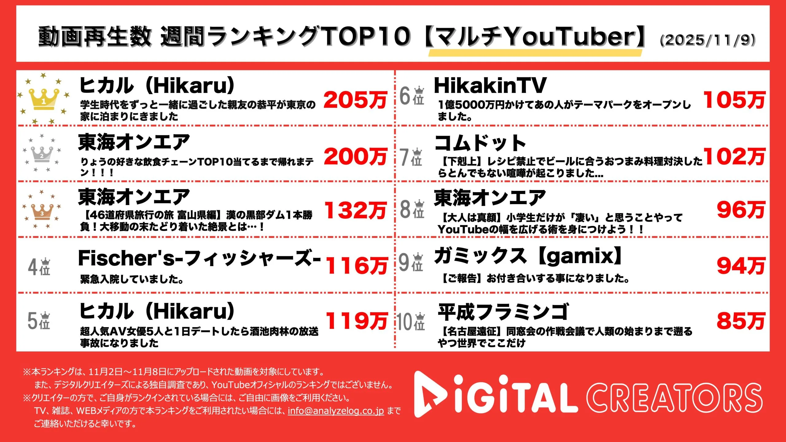 今回は11月2日~11月8日にYouTubeで公開された動画ランキングマルチYoutuber部門TOP10を発表。(11月9日集計)